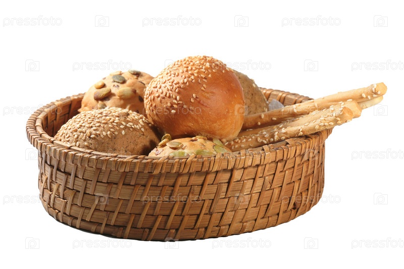 Булочки с кунжутом и семечками в корзинке на белом фоне