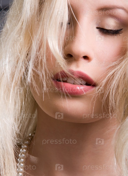 Лицо красивой блондинки с закрытыми глазами на черном фоне
