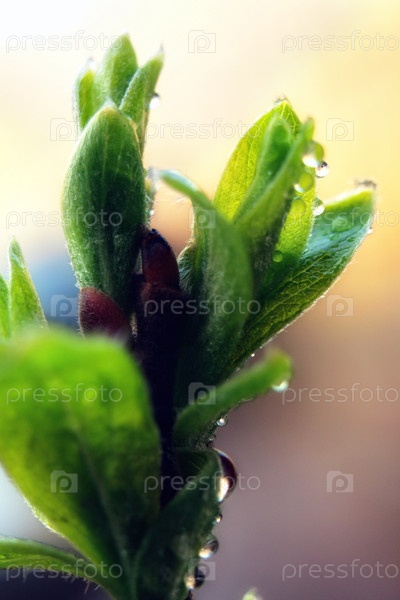 Молодые листья с каплями росы крупным планом
