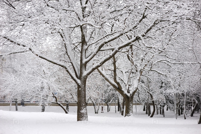 Деревья, покрытые инеем, в городском парке