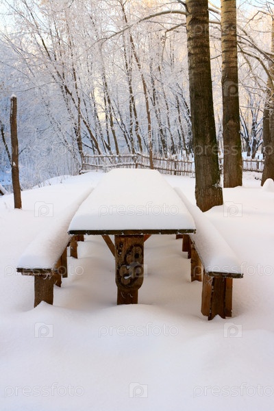 Деревянные скамейка и стол, покрытые снегом