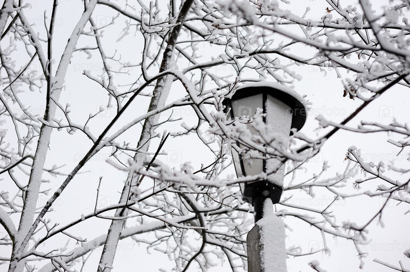 Ветви деревьев и фонарь, покрытые инеем