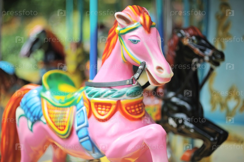 Розовая и черная карусельные лошадки в городском парке