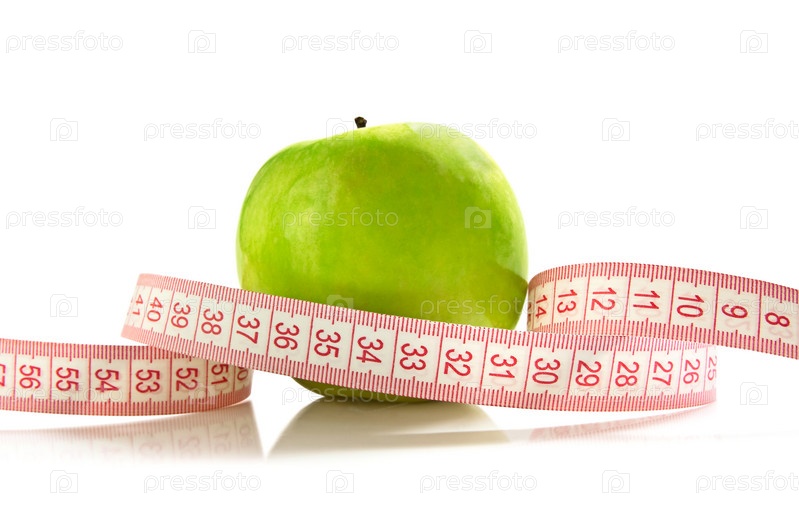 Сантиметровая лента вокруг зеленого яблока, изолированного на белом