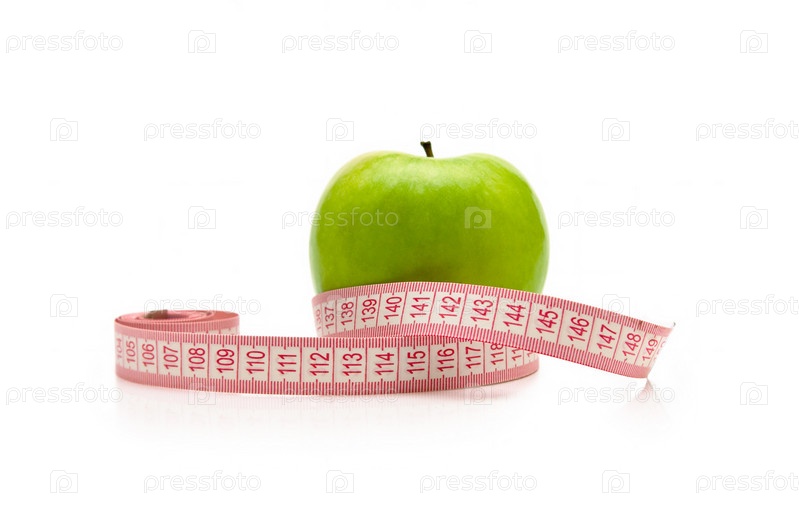 Сантиметровая лента вокруг зеленого яблока, изолированного на белом
