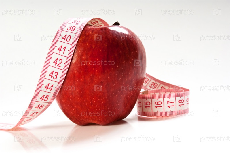 Сантиметровая лента вокруг красного яблока, изолированного на белом