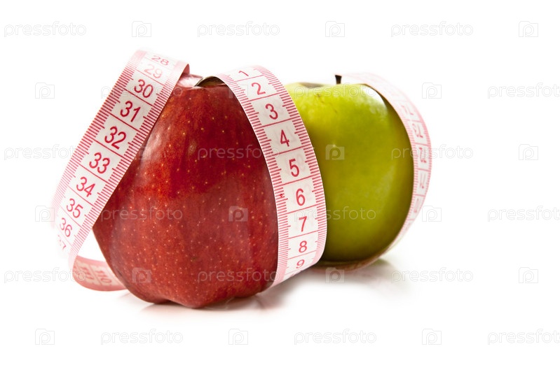 Сантиметровая лента вокруг красного и зеленого яблок, изолированных на белом
