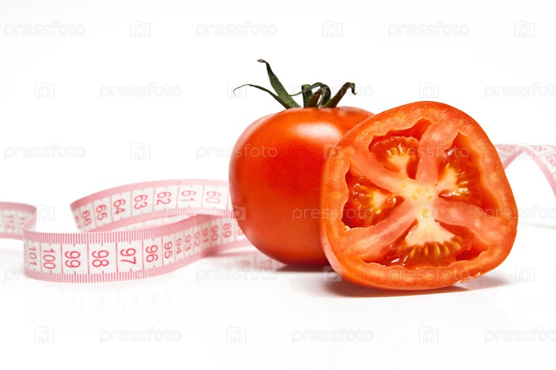 Свежие помидоры и сантиметровая лента, изолированные на белом