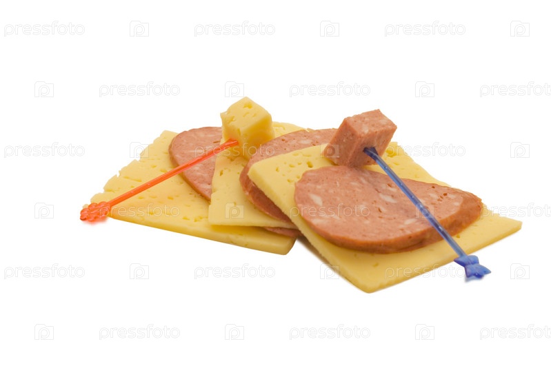 Нарезанные сыр и колбаса на белом фоне