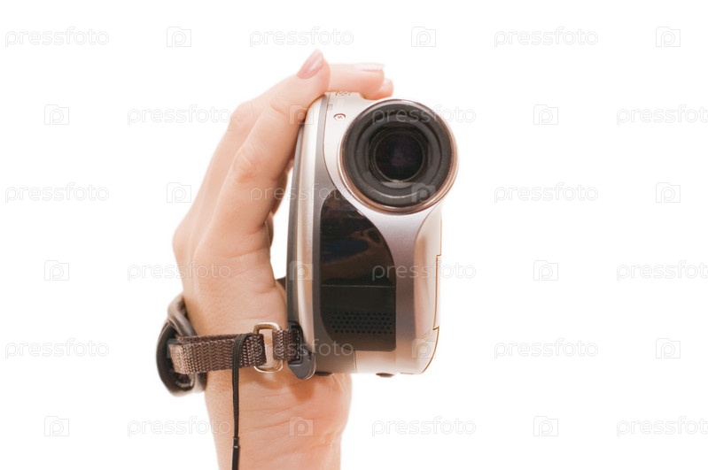 Видеокамера в женской руке на белом фоне
