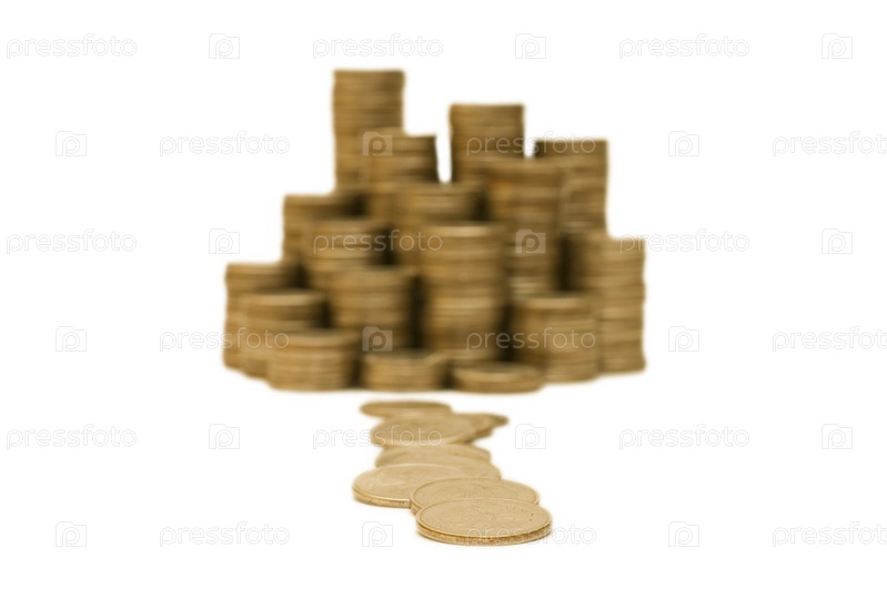 Стопки золотых монет на белом фоне