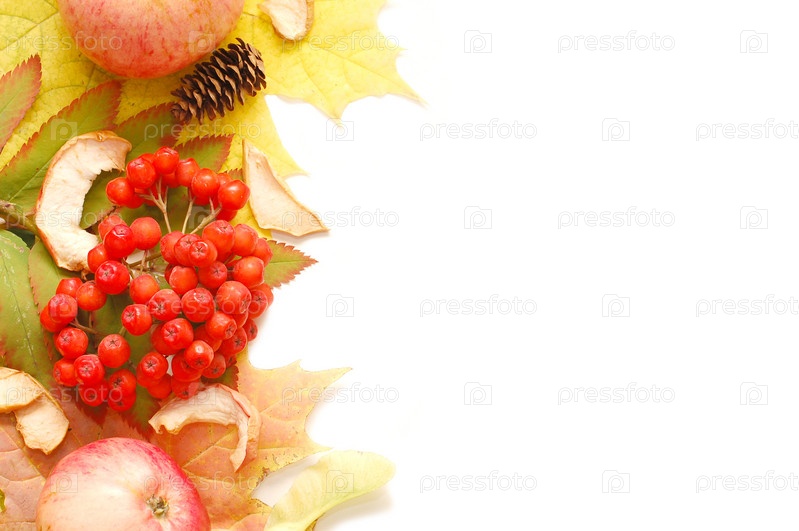 Рябина, яблоки и сушеные грибы на осенних листьях