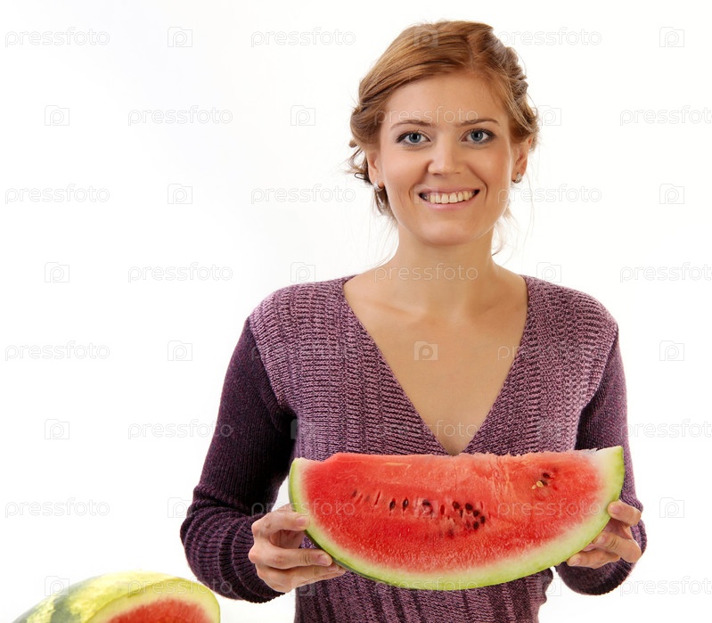 Женщина с арбузом на белом фоне