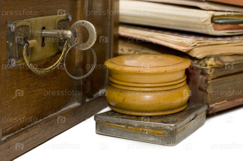 Старый ящик с ключом и различные старые вещи крупным планом