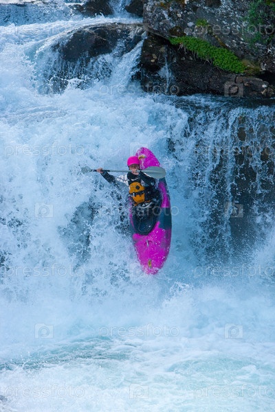 Каякер сплавляется по водопаду в Норвегии