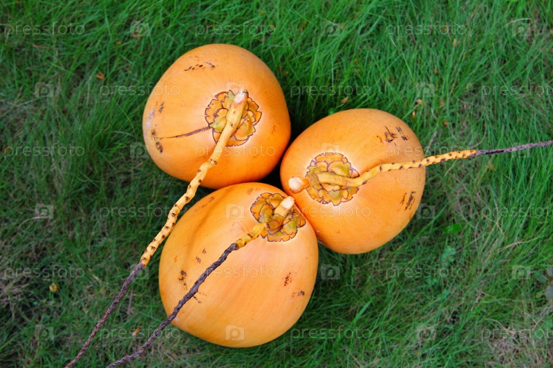 Кокосы на зеленой траве крупным планом