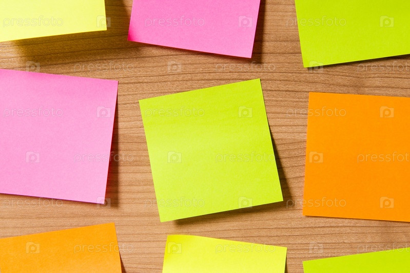 Разноцветные стикеры на деревянной поверхности крупным планом