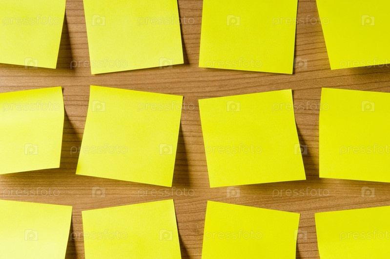 Много желтых стикеров на деревянной поверхности крупным планом