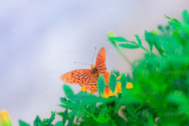 Красивая бабочка сидит на желтой календуле в саду