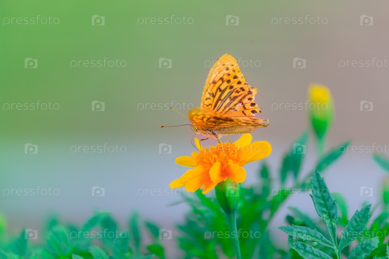 Красивая бабочка сидит на желтой календуле в саду