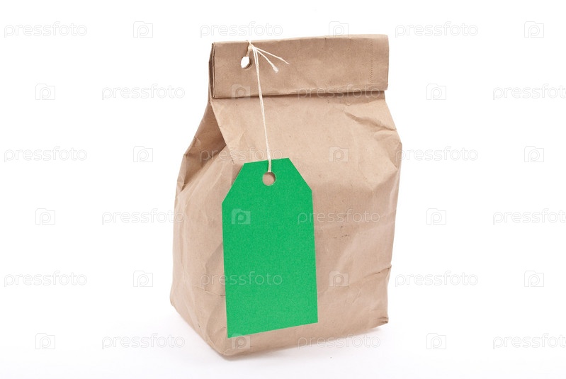 Бумажный пакет с зеленым ярлыком на белом фоне