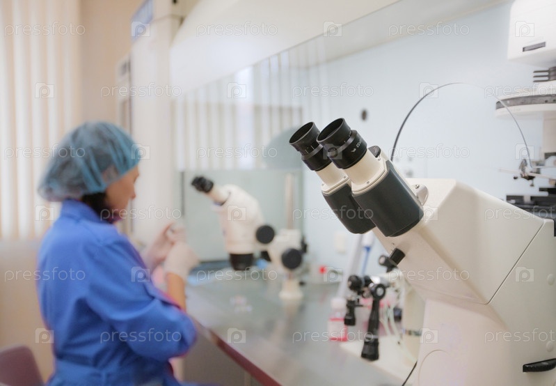 Женщина в синем медицинском халате проводит исследование в лаборатории