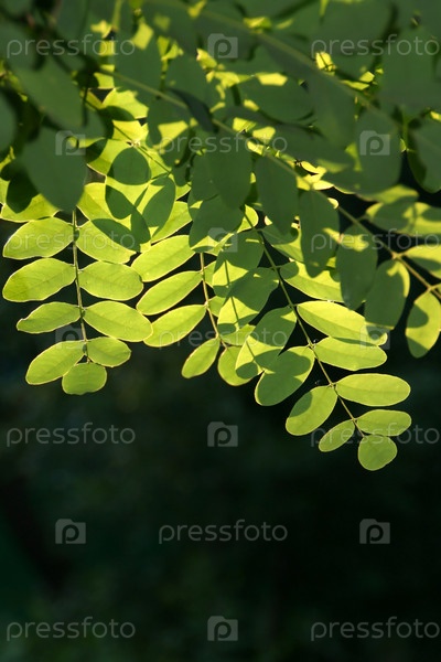 Листья акации летним солнечным днем на темном фоне
