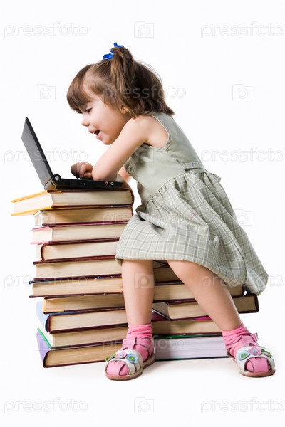 Удивленная девочка дошкольного возраста сидит перед ноутбуком и смотрит на дисплей с открытым ртом