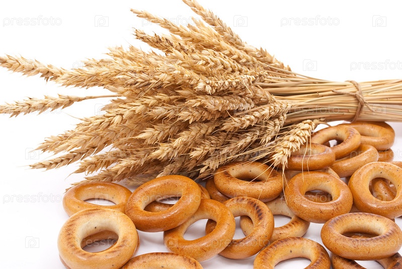 Рассыпанные сушки и колосья пшеницы