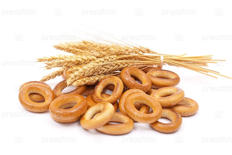 Рассыпанные сушки и колосья пшеницы