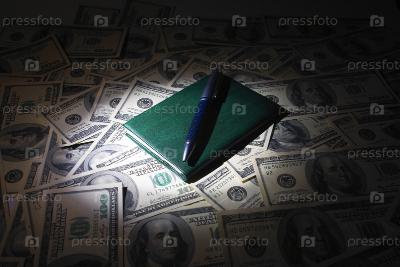 Ноутбук и ручка на фоне денег