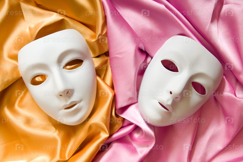 Две театральные маски на розовой и желтой ткани