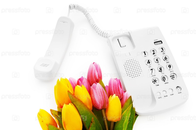 Белый офисный телефон и тюльпаны