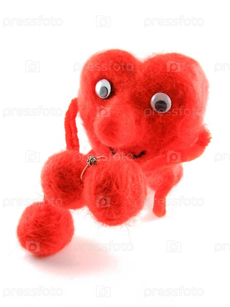 Игрушечное красное сердце стоит на коленях с золотым кольцом