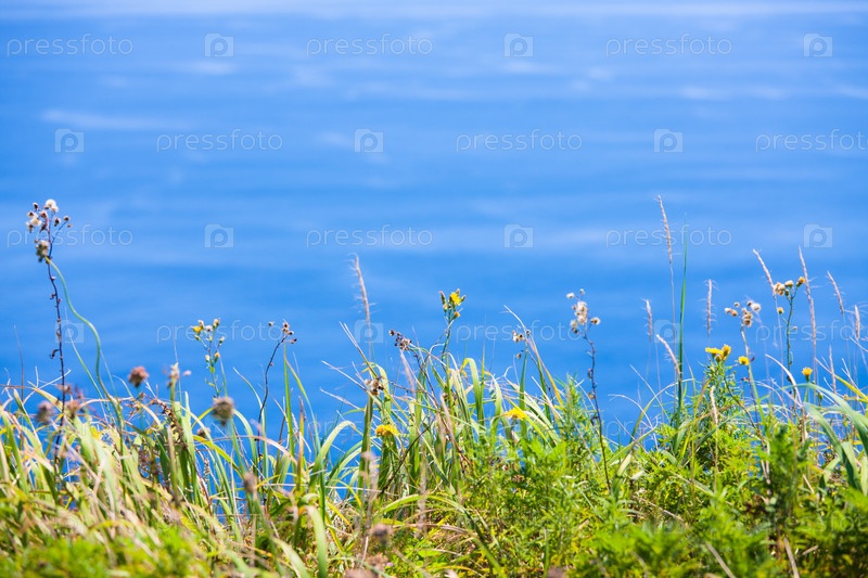 Трава и полевые цветы на фоне синего моря