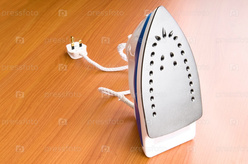 Современный электрический утюг на деревянном фоне