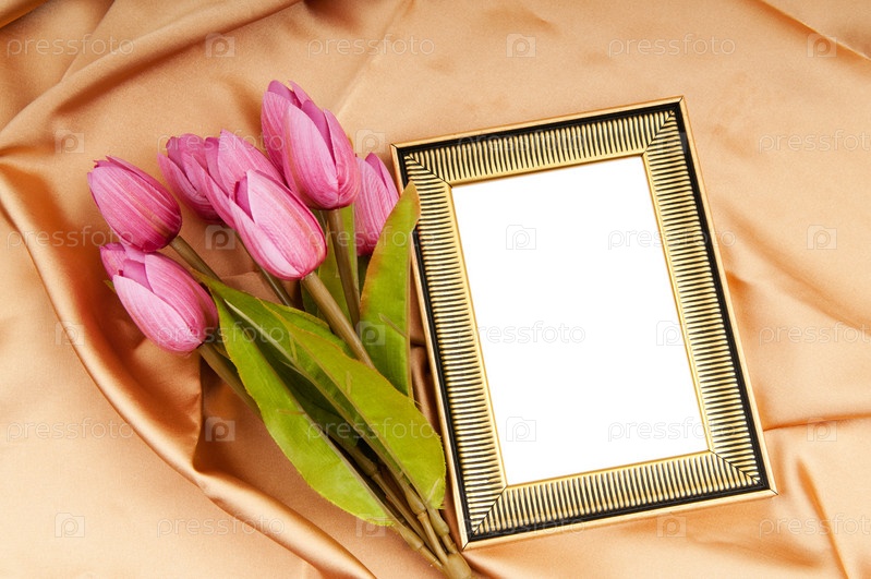 Фоторамка и тюльпаны на атласной ткани