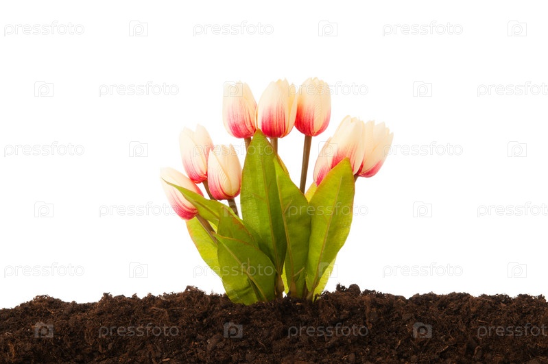 Тюльпаны, растущие в земле, изолированные на белом фоне