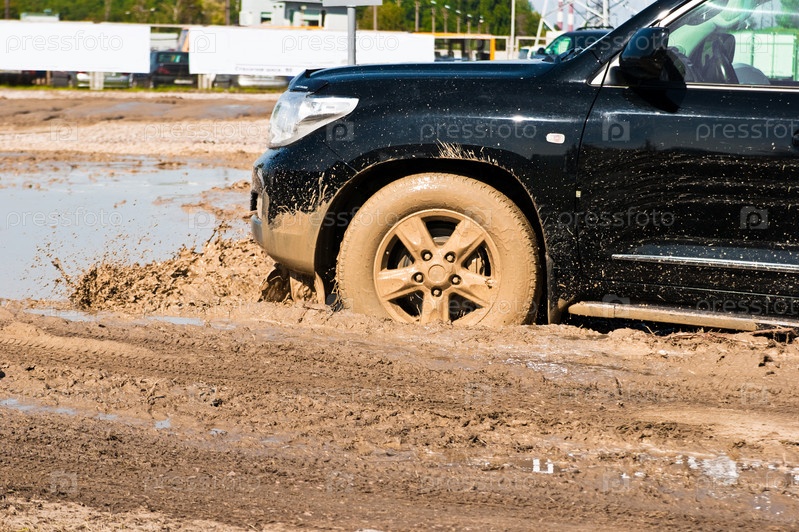 Капот черного автомобиля, движущегося по грязи