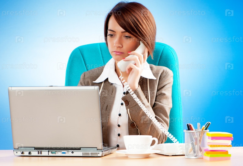 Молодая деловая девушка, работающая за ноутбуком