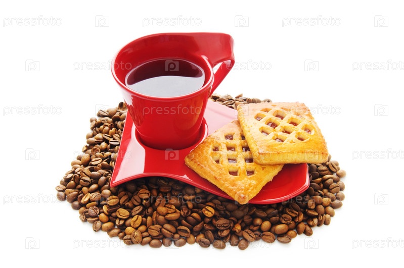 Чашечка кофе и печенье, лежащие на кофейных зернах