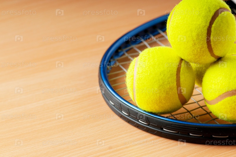 Ракетка для тенниса и желтые мячики крупным планом