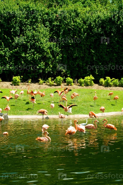 Розовые фламинго на берегу водоема в солнечный день