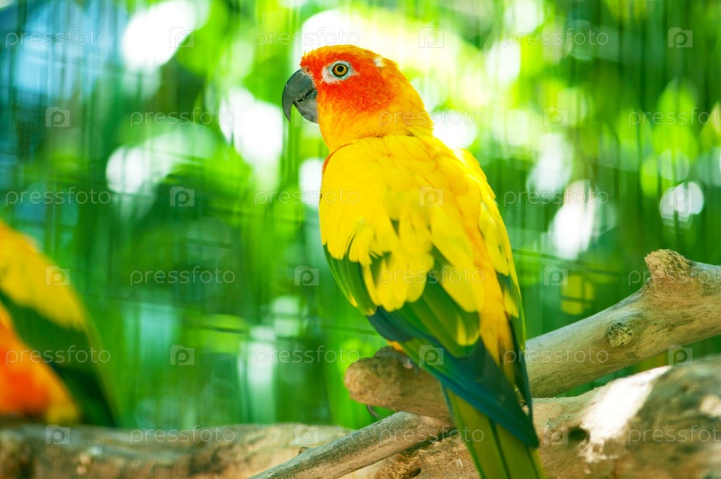 Яркий попугай сидит на ветке