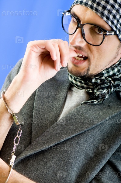 Стильный молодой человек в наручниках на голубом фоне