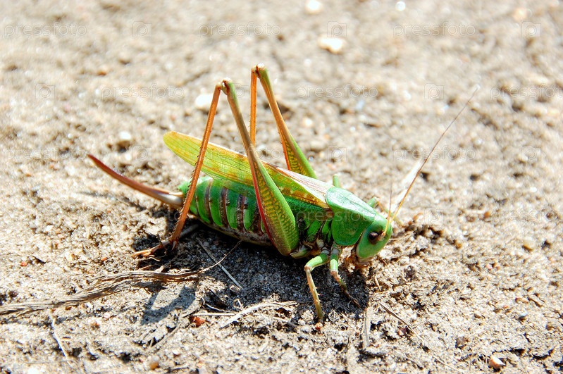 Зеленый кузнечик на песке крупным планом