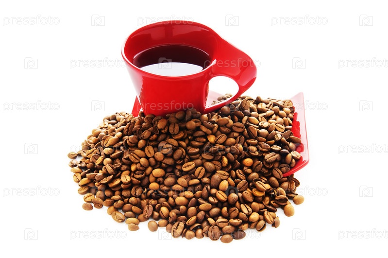 Кружка кофе и кофейные зерна на белом фоне