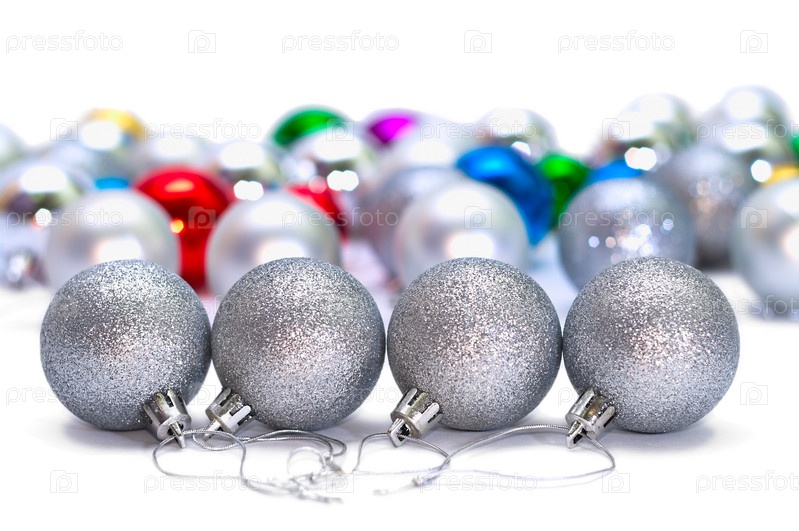 Четыре новогодних металлических шара на переднем плане и много цветных шаров на фоне
