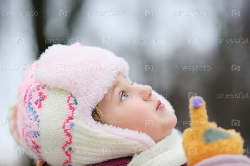 По-зимнему одетая девочка показывает вверх пальцем