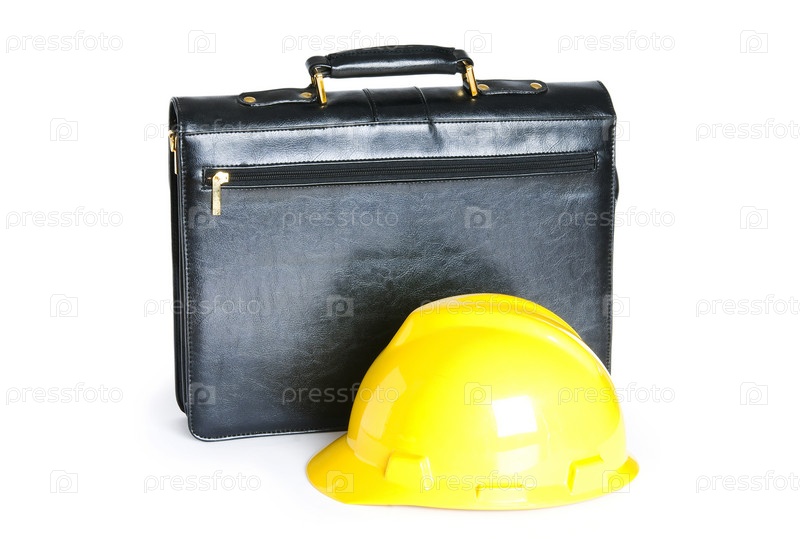 Желтая каска и кожаный портфель на белом фоне крупным планом